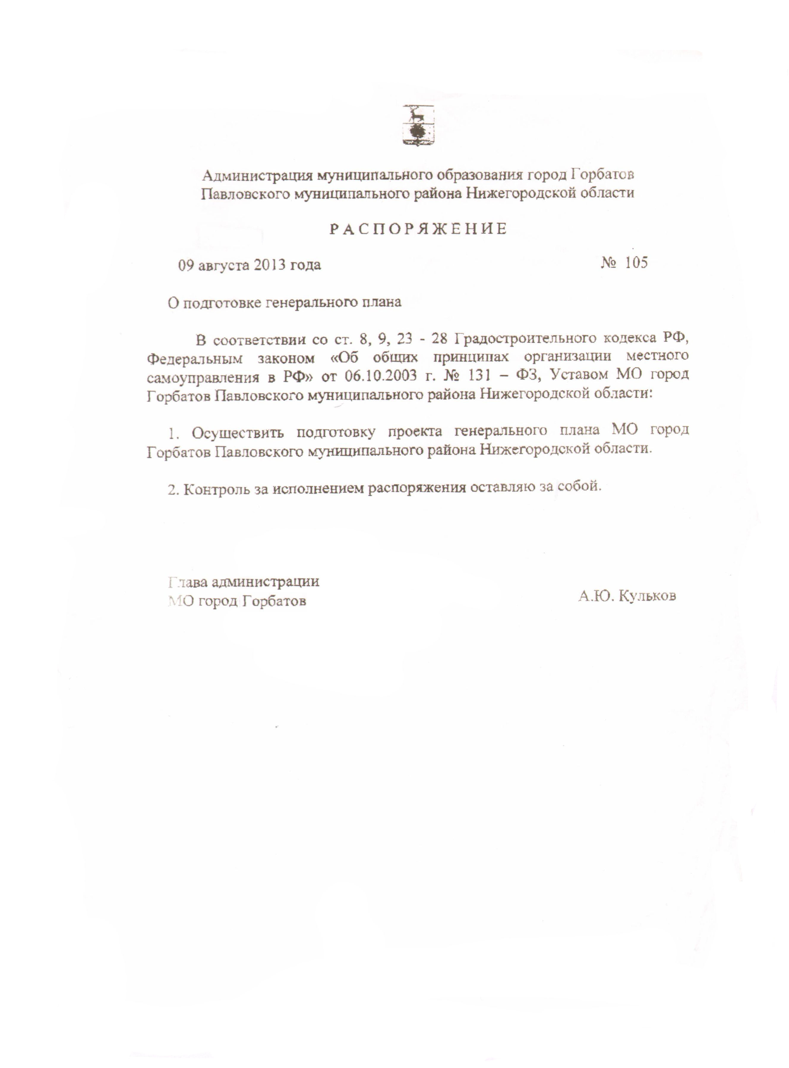 • Распоряжение администрации МО г. Горбатов Павловского муниципального района Нижегородской области от 09.08.2013 г. № 105 «О подготовке генерального плана» (ссылка на скачивание документа).