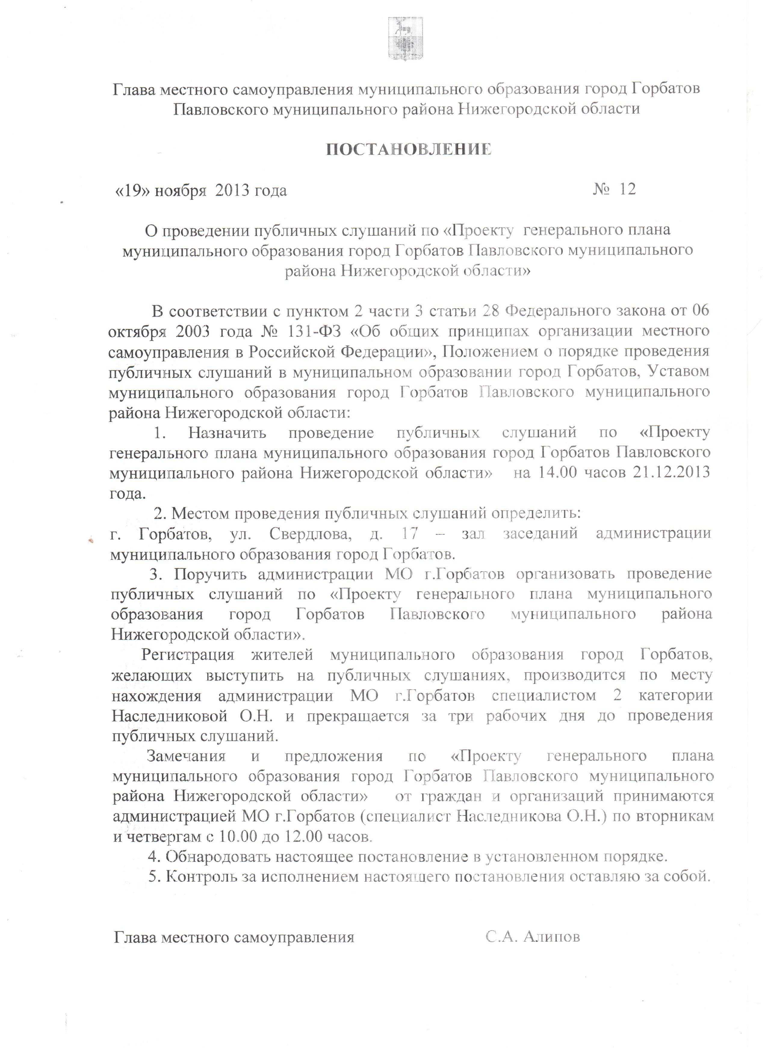 • Постановление Главы местного самоуправления МО г. Горбатов Павловского муниципального района Нижегородской области от 19.11.2013 г. № 12 «О проведении публичных слушаний по «Проекту генерального плана МО г. Горбатов Павловского муниципального района Нижегородской области» (ссылка на скачивание документа).